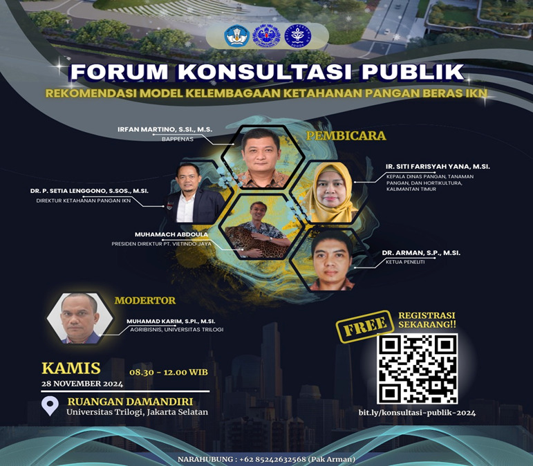 Program Studi Agribisnis menyelenggarakan Diskusi dan Focus Group Discussion (FGD) dengan tema: “Rekomendasi Model Kelembagaan Ketahanan Pangan Beras IKN” Kegiatan berllangsung tanggal 28 November 2024 di Ruang Damandiri Universitas Trilogi, Jakarta. Pemateri dari FGD ini adalah (1) Irfan Martino S.Si, M.Si (Kementerian PPN/Bappenas); (2) Dr. P. Setia lenggono (Direktur Ketahanan Pangan IKN); (3) Mohammad Abdoula (Managing Direktur PT Vietindo Jaya); (4) Ir. Siti Farisyah Yana, M.Si (Kepala Dinas Tanaman Pangan dan Hortikultura Kaltim)l dan (5) Dr. Arman (Ketua Peneliti). Kesimpulan diskusi adalah ketahanan dan kedaulatan pangan di IKN menghadapi tantangan keterbatasan lahan, rendahnya produktivitas, serta peningkatan kebutuhan akibat pemindahan penduduk, sehingga pemenuhannya tidak tergantung pendekatan konvensional berbasis beras semata. Diperlukan strategi terpadu yang mengombinasikan intensifikasi dan ekstensifikasi terbatas, diversifikasi pangan lokal, penguatan distribusi pangan nasional sebagai solusi jangka pendek, serta penerapan pertanian regeneratif dan urban farming yang selaras dengan visi rendah karbon IKN. Secara kelembagaan, direkomendasikan untuk pengembangan korporasi petani berbasis multi-pihak yang terintegrasi dari hulu hingga hilir, didukung kawasan produksi pangan, industri pengolahan, manajemen stok, dan sistem data pangan yang kuat. Sekaligus mengintegrasikan nilai budaya lokal, perubahan pola konsumsi, dan penguatan sumber daya manusia pertanian sebagai fondasi keberlanjutan pangan jangka panjang.