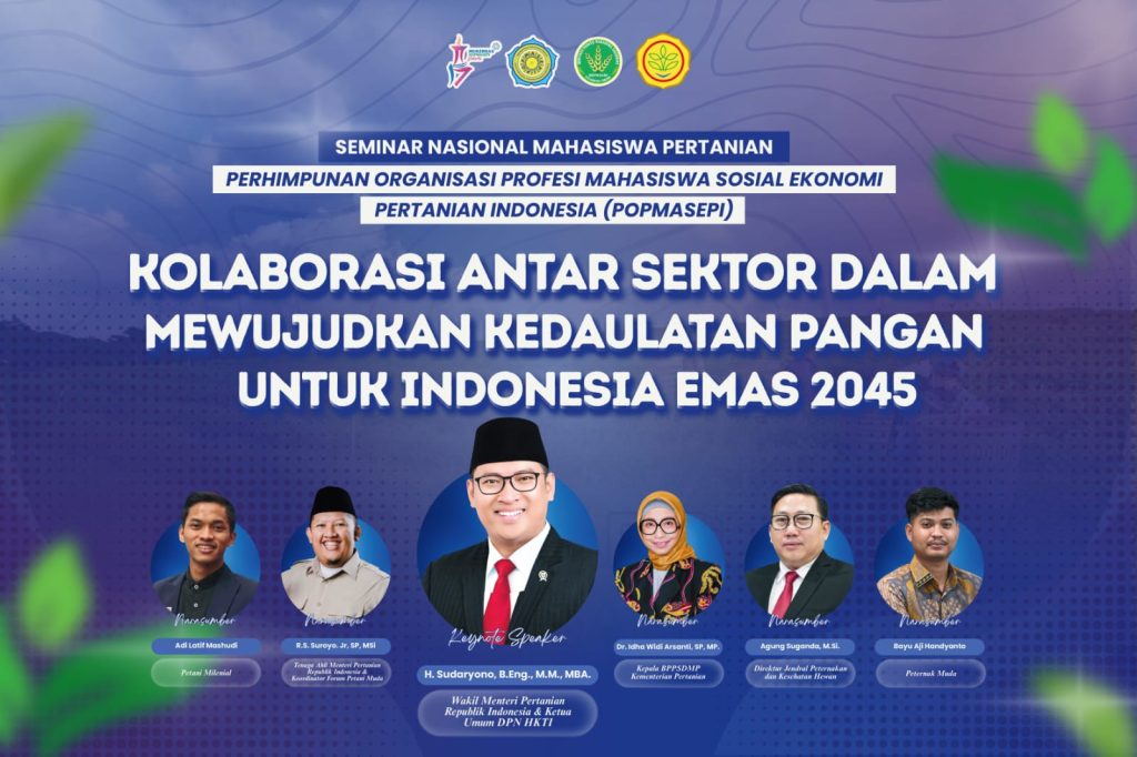 Seminar Nasional Mahasiswa Pertanian diselenggarakan oleh Perhimpunan Organisasi Profesi Mahasiswa Sosial Ekonomi Pertanian Indonesia (POPMASEPI) dengan mengusung tema “Untuk Indonesia Emas 2045: Mewujudkan Kedaulatan Pangan melalui Kolaborasi Antar Sektor.” Kegiatan ini dilaksanakan pada 10 September 2025 dan bertempat di Kementerian Pertanian Republik Indonesia. Kegiatan ini dihadiri oleh kurang lebih 200 peserta yang merupakan mahasiswa dan […]