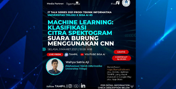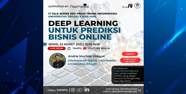 IT Talk Series 2021 #07 | Spatial Tracking Untuk Pemasangan Spartpart Mobil | Prodi Teknik Informatika Ikuti webinar kali ini bersama : Narasumber – Zihan Noor Abdillah (Mahasiswa Teknik Informatika Universitas Trilogi) Acara ini akan dilaksanakan pada : Kamis, 1 April 2021 08.00 WIB – Selesai Live melalui TAMPIL dan YouTube BISA AI Didukung oleh:…